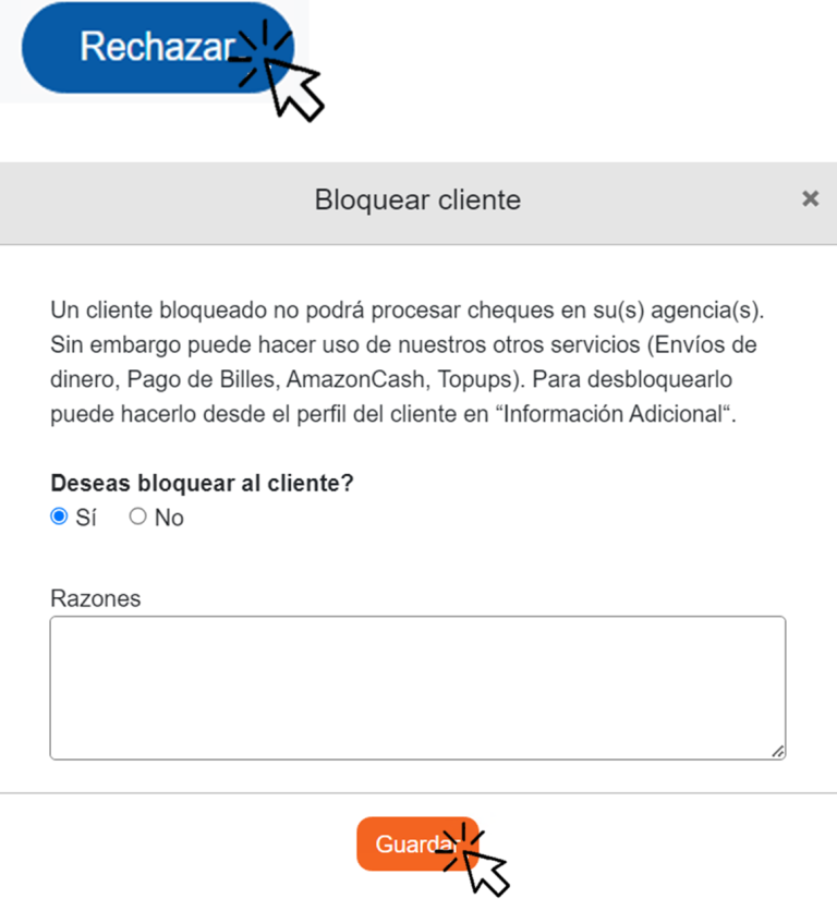 • Puede rechazar la transacción si considera alto riesgo y bloquear al cliente solo para el procesamiento de cheques.