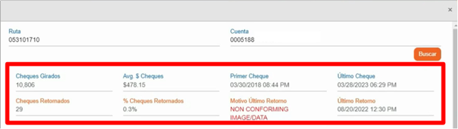 Fecha del último cheque procesado, promedio de la cantidad que ese girador procesa por cheque, porcentaje de cheques retornados, motivo de último retorno y fecha del último cheque retornado.