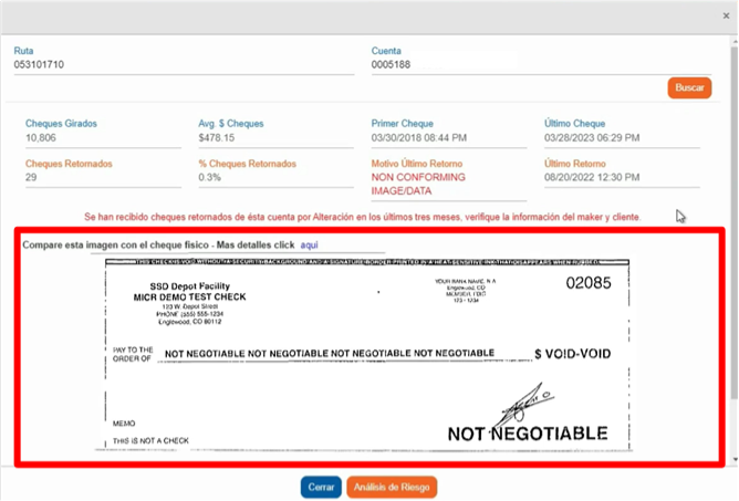 En la parte inferior se mostrará un cheque previamente aceptado por nuestro banco para que realice la comparación con el cheque que le entrego su cliente.
