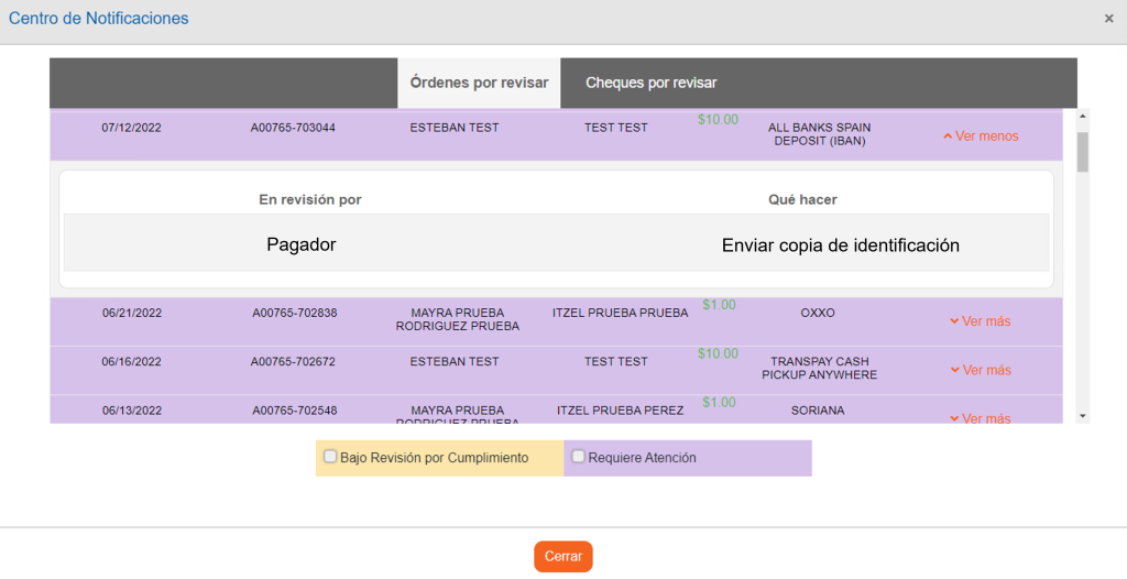 Los envíos que se encuentran en este estado son envíos detenidos por el pagador, ya sea que requieren una identificación o el formato conozca a su cliente.